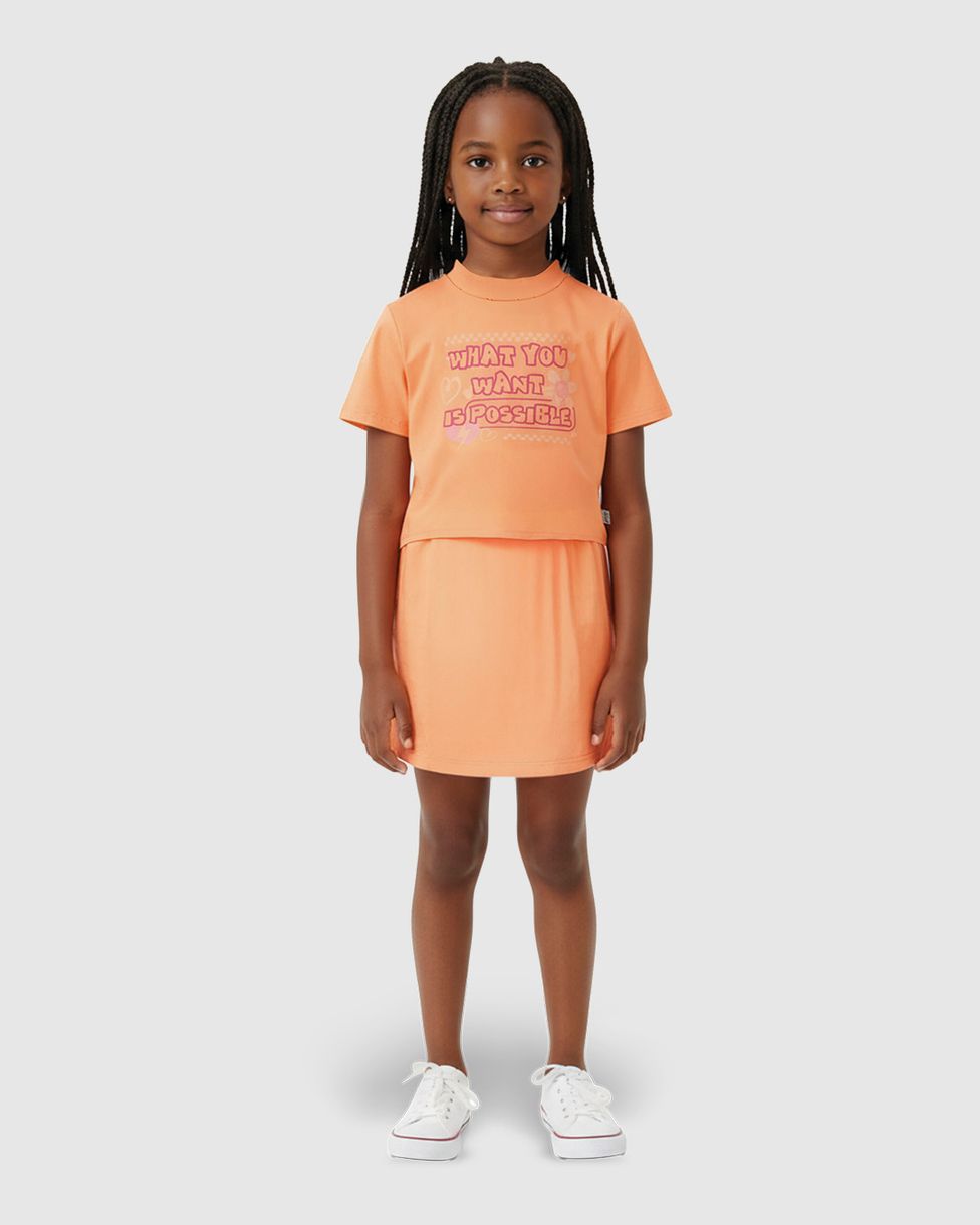 Conheça o Conjunto Infantil Menina Blusa What You Want Is Possible! A blusa, feita em malha algodão, possui uma estampa divertida com a frase motivacional "What you want is possible" ("O que você quer é possível"), complementada por esferas de PVC e uma etiqueta decorativa. O shorts saia de malha texturizada, oferece um caimento leve e soltinho, garantindo o máximo de conforto e estilo para o dia a dia da sua menina.