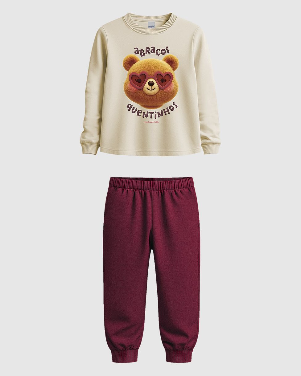 A Malwee Kids apresenta o Conjunto Blusão e Calça, indispensável para o Outono Inverno 2026. Confeccionado em moletom flanelado, ele garante o máximo aconchego para os dias frios. O destaque é a estampa de ursinho com a frase "Abraços Quentinhos" e detalhes em glitter.