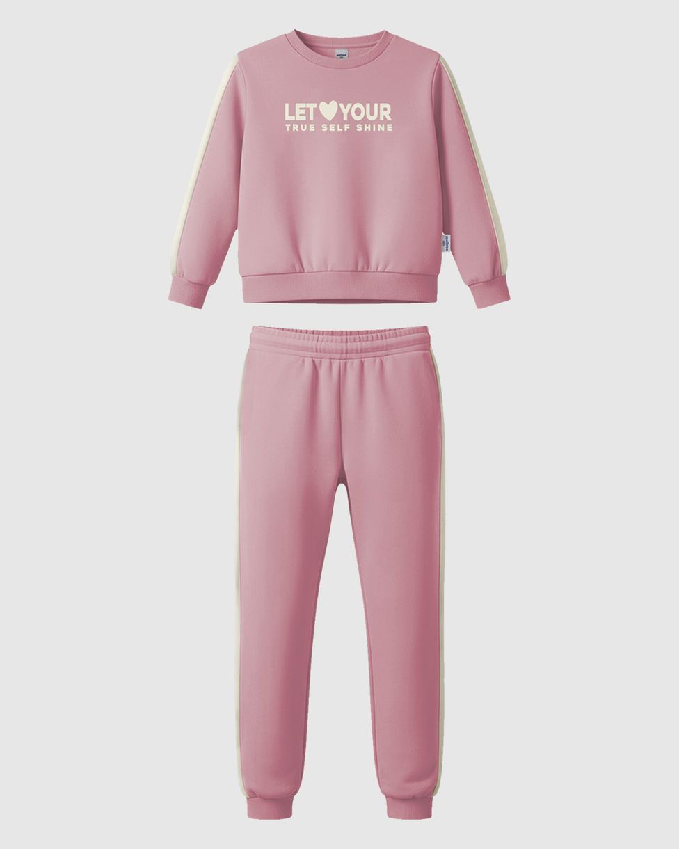 O Conjunto Infantil Menina Malwee Kids é ideal para expressar a personalidade com brilho e conforto. Composto por blusão e calça, o modelo da coleção Outono Inverno 2026 traz a mensagem "Let Your True Self Shine", unindo estilo e bem-estar para o dia a dia das meninas.