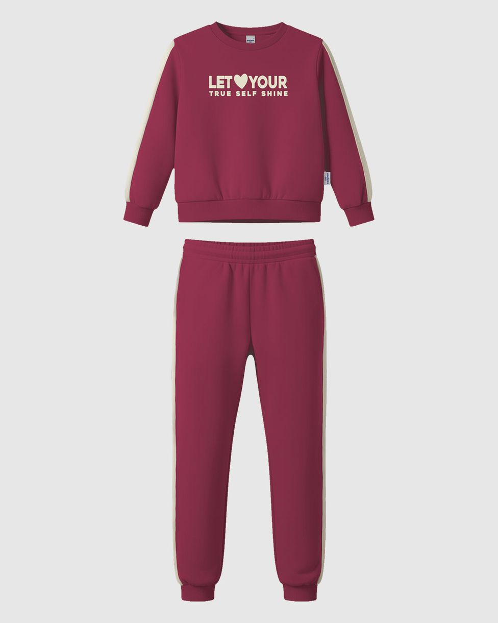 O Conjunto Infantil Menina Malwee Kids é ideal para expressar a personalidade com brilho e conforto. Composto por blusão e calça, o modelo da coleção Outono Inverno 2026 traz a mensagem "Let Your True Self Shine", unindo estilo e bem-estar para o dia a dia das meninas.