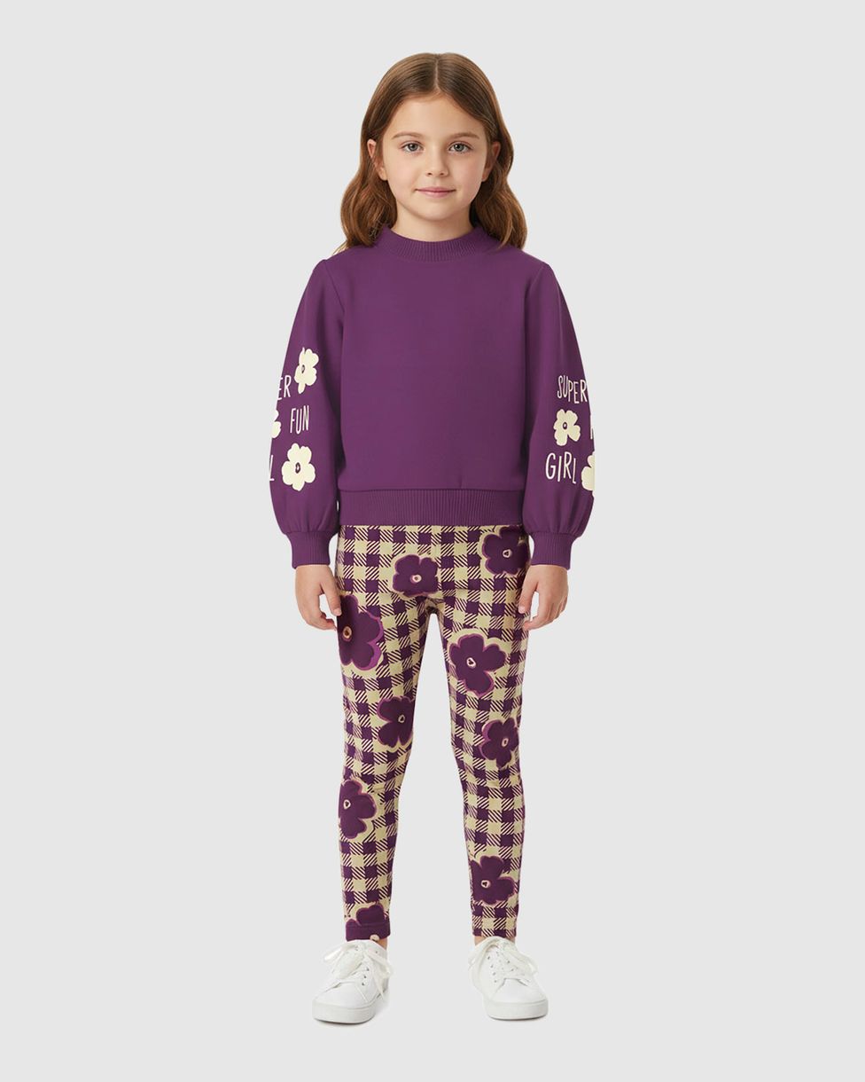 O Conjunto Infantil Menina Malwee Kids destaca-se pelo visual moderno e cheio de personalidade. Composto por um blusão com mangas bufantes e estampa em puff, acompanhado de uma calça em padronagem xadrez floral, ele garante um look fashionista e confortável para o Outono Inverno.