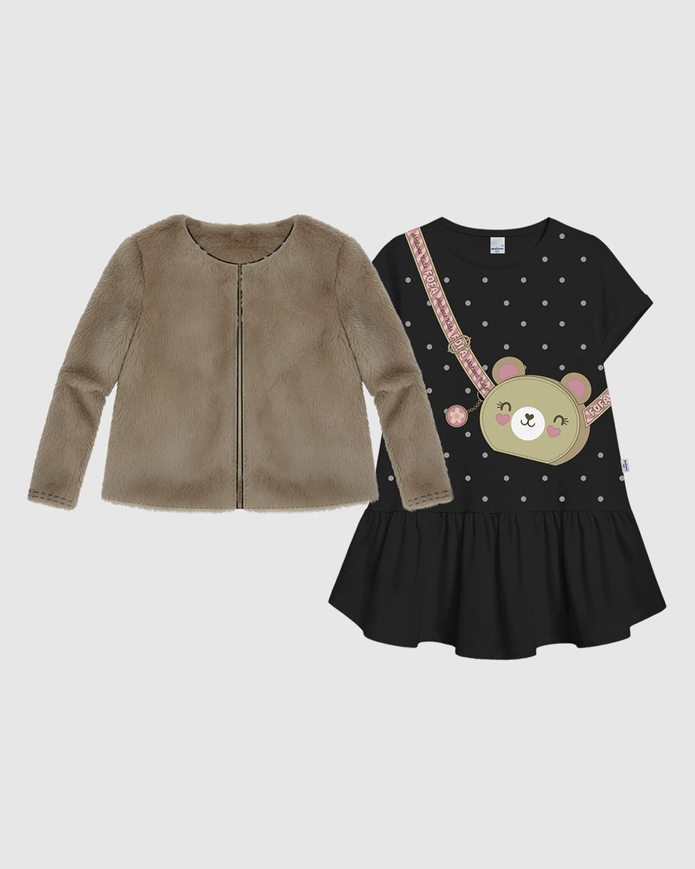 Conjunto Infantil Menina Casaco Pelúcia E Vestido Estampa Ursinho Malwee Kids