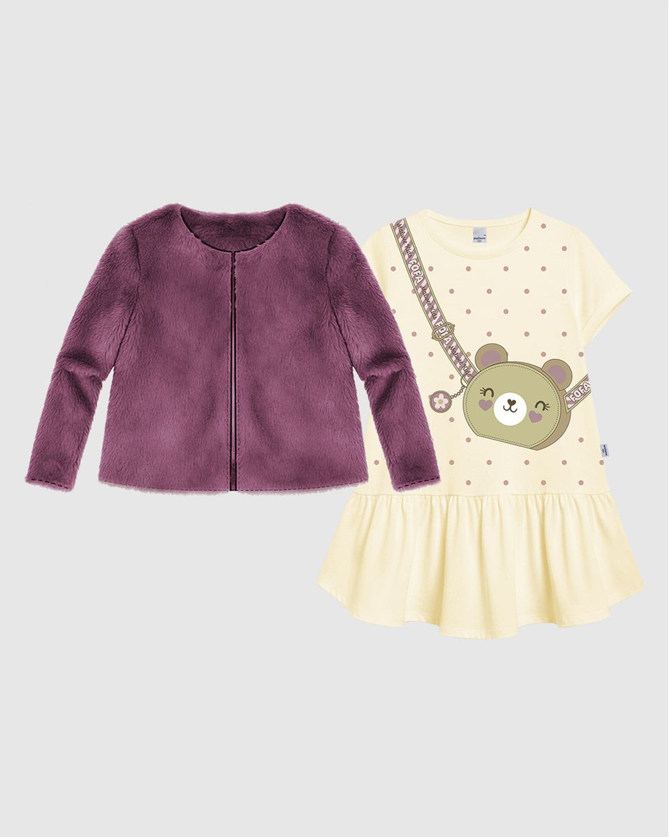 InfantilConjuntosConjuntos CurtosConjunto Infantil Menina Casaco Pelúcia E Vestido Estampa Ursinho Malwee Kids