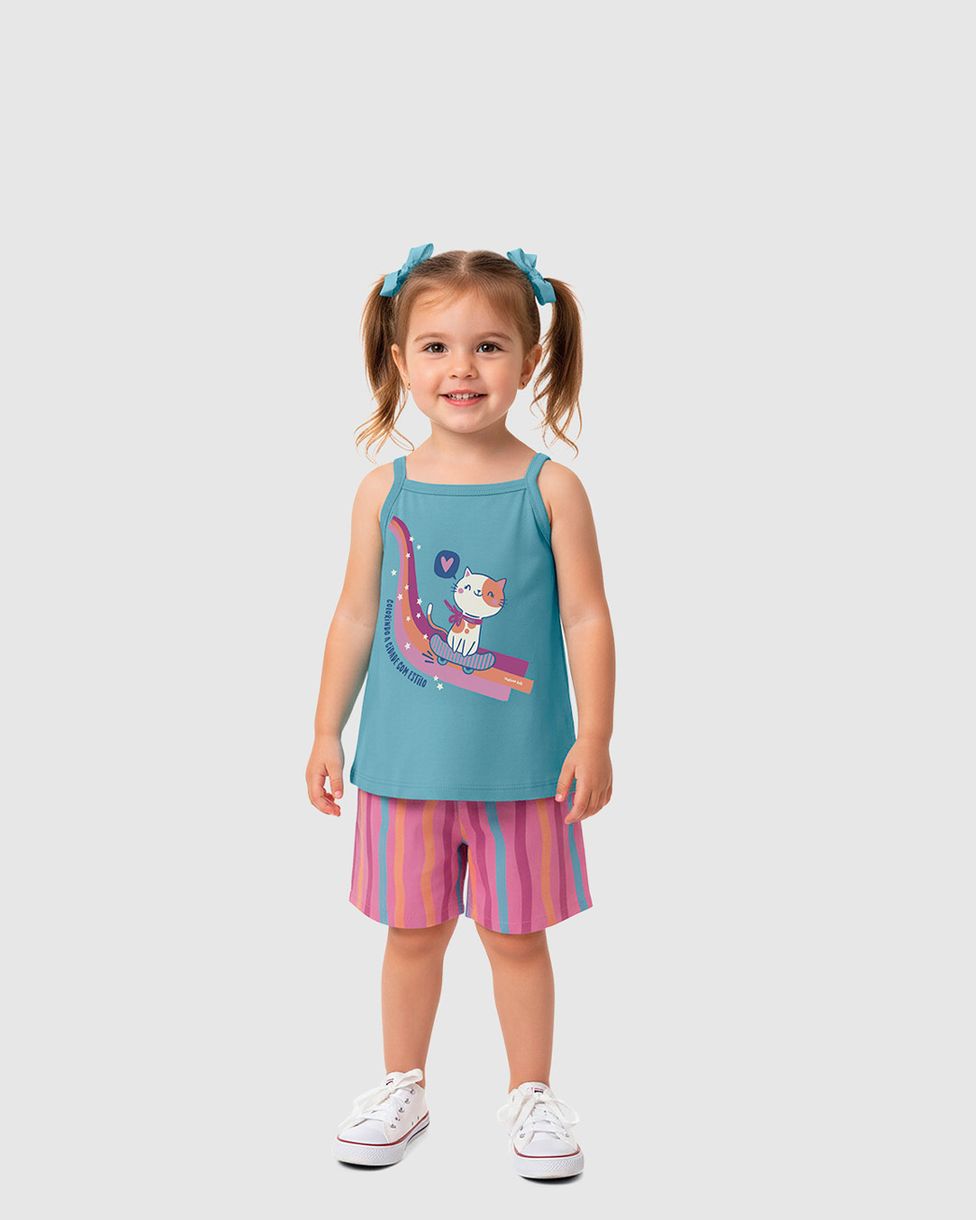 Sua menina vai colorir a cidade com estilo no Conjunto Infantil Menina de Algodão Malwee Kids! Com uma regata em algodão macio e estampa de gatinho skatista com glitter, e um shorts listrado super divertido, este conjunto é perfeito para aventuras cheias de conforto e alegria. Uma peça essencial para um verão vibrante e cheio de descobertas!