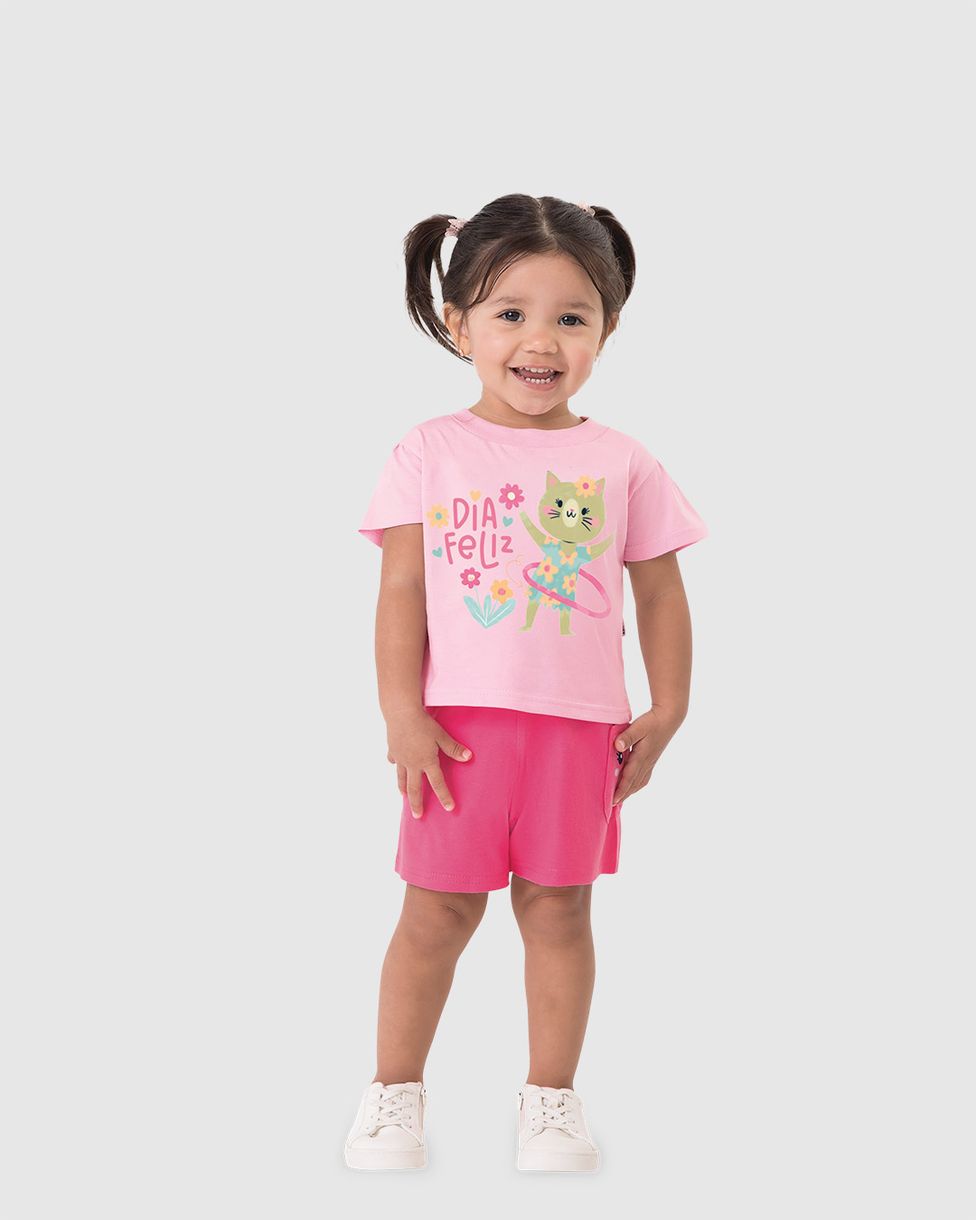 Conjunto Infantil Menina Dia Feliz Shorts Bolso Em Malha Rajada Malwee Kids Rosa - 1