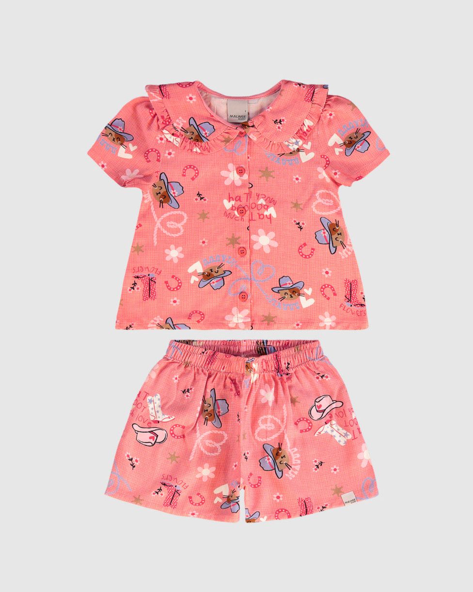 Conjunto Infantil Menina Estampado Camisa Gola Babado Em Viscose Malwee Kids