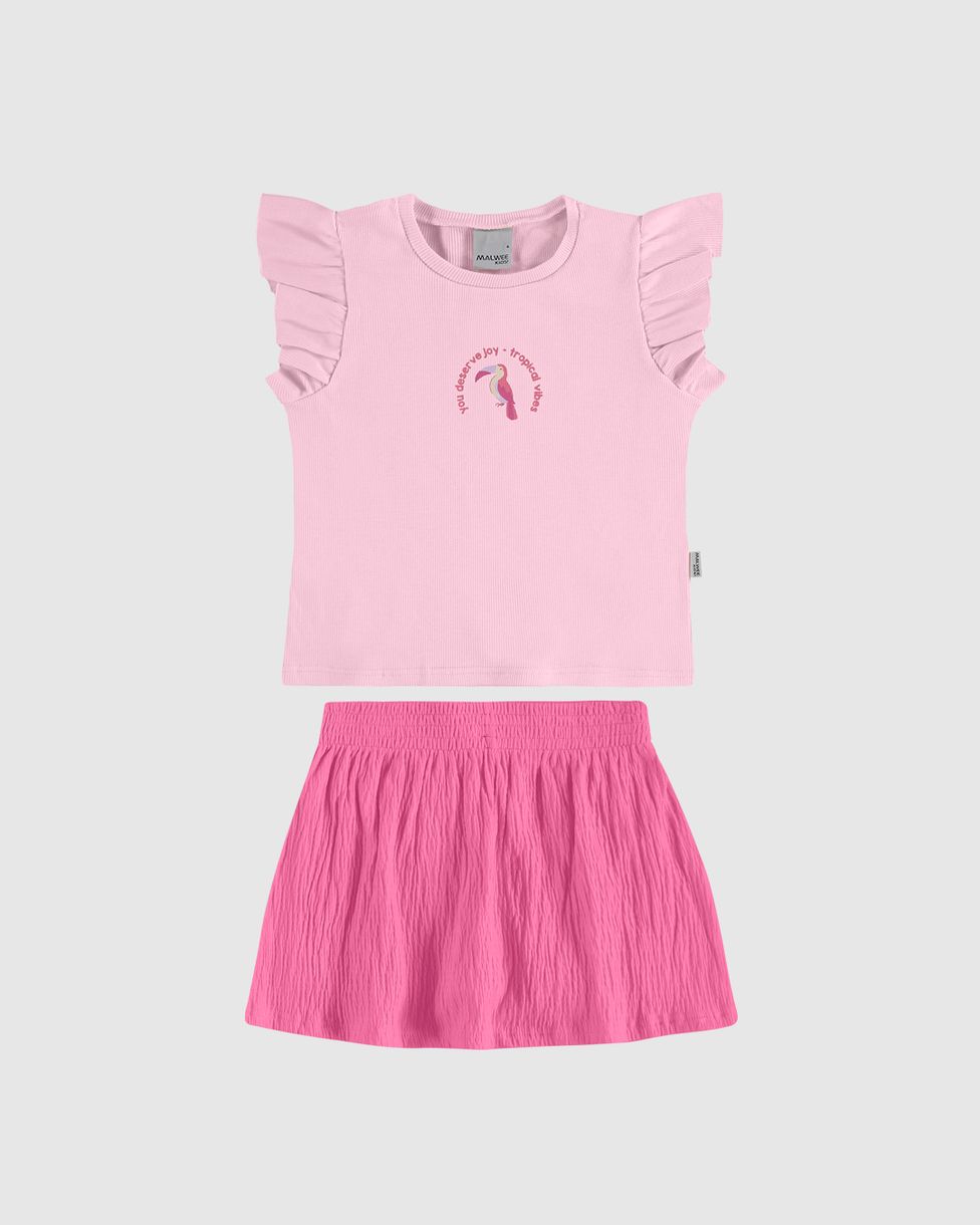 Conjunto Infantil Menina You Deserve Joy - Tropical Vibes Malwee Kids: Um conjunto cheio de atitude e estilo para os momentos especiai. Feito em ribana e malha texturizada, une conforto e visual diferenciado. Com blusa estampada e shorts saia, é perfeito para compor looks modernos e fresquinhos.