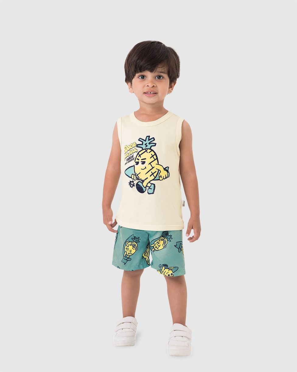 O Conjunto Infantil Menino Aloha Total! é perfeito para o verão, combinando meia malha 100% algodão na regata e bermuda em tecido microfibra leve e confortável. Com estampa divertida e efeito HD, garante estilo e frescor para os garotos aproveitarem o dia com muita alegria.