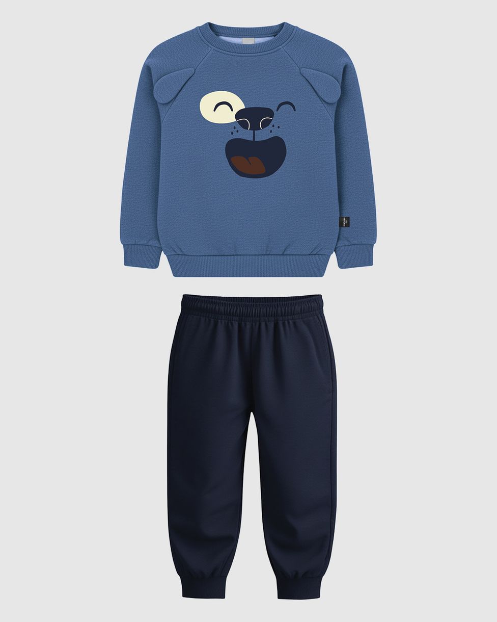 O Conjunto Infantil Menino Blusão Com Aplique da Malwee Kids une diversão e conforto para os dias frios. Produzido em moletom flanelado, o conjunto destaca-se pelo aplique interativo de orelhinhas e estampa de bichinho, garantindo um visual lúdico e muito aconchego para as brincadeiras.