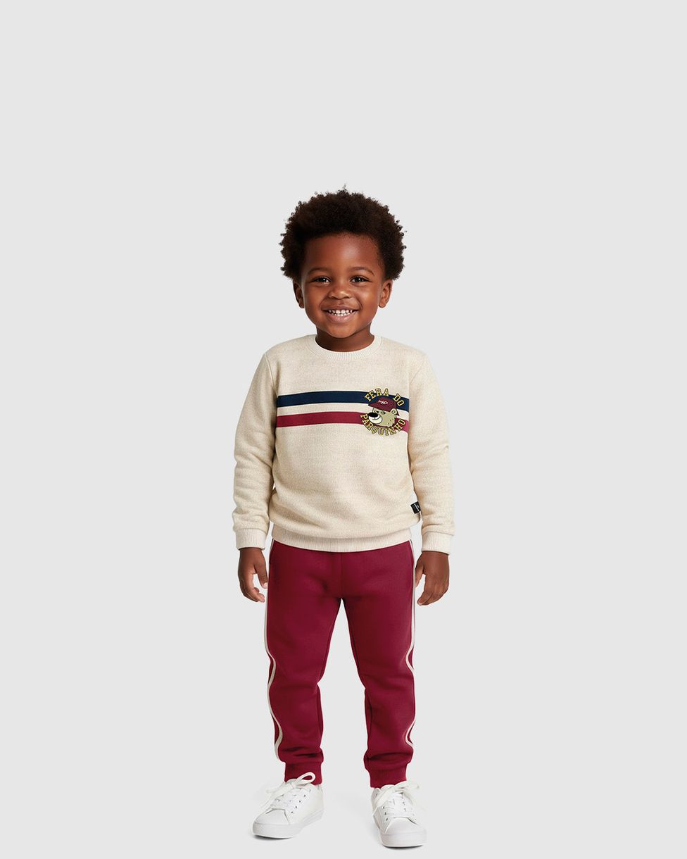 O Conjunto Infantil Menino Blusão e Calça é a aposta certa para um visual prático e quentinho. O blusão em moletom flanelado destaca-se pela listra frontal e estampa de personagem, enquanto a calça coordenada garante o bem-estar. Um look versátil e essencial para o Outono Inverno.