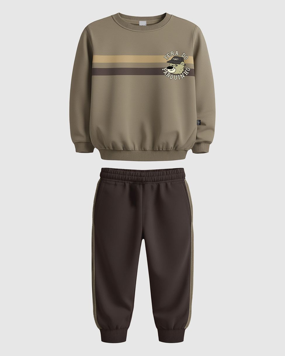O Conjunto Infantil Menino Blusão e Calça é a aposta certa para um visual prático e quentinho. O blusão em moletom flanelado destaca-se pela listra frontal e estampa de personagem, enquanto a calça coordenada garante o bem-estar. Um look versátil e essencial para o Outono Inverno.