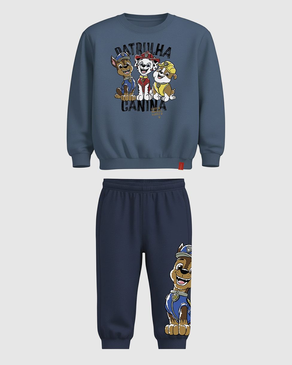 O Conjunto Infantil Menino Malwee Kids traz os heróis da Patrulha Canina® para o inverno. Confeccionado em moletom flanelado, garante máximo conforto térmico e toque macio. Com uma estampa interativa na calça, é a escolha perfeita para unir diversão e proteção nos dias frios.