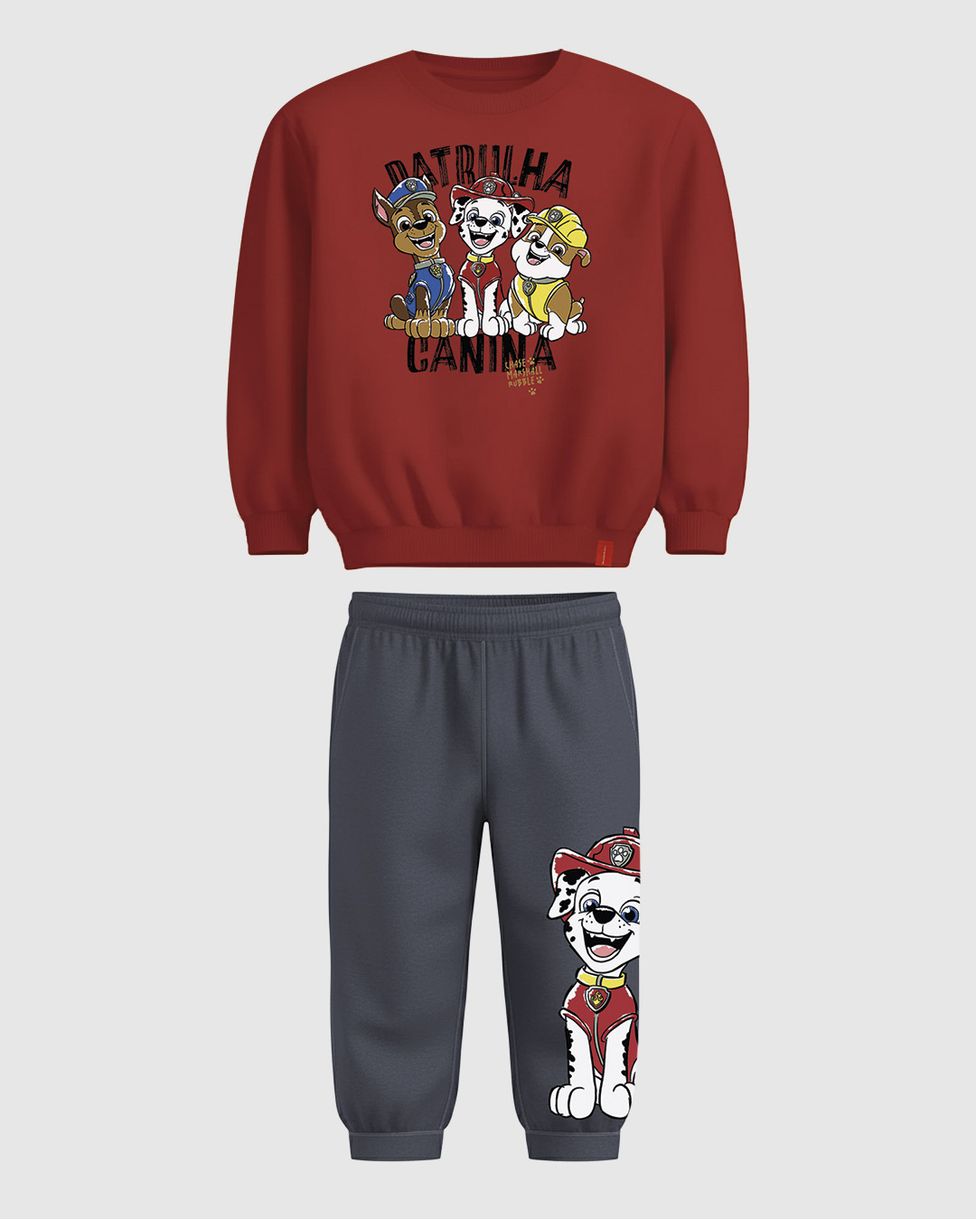 O Conjunto Infantil Menino Malwee Kids traz os heróis da Patrulha Canina® para o inverno. Confeccionado em moletom flanelado, garante máximo conforto térmico e toque macio. Com uma estampa interativa na calça, é a escolha perfeita para unir diversão e proteção nos dias frios.