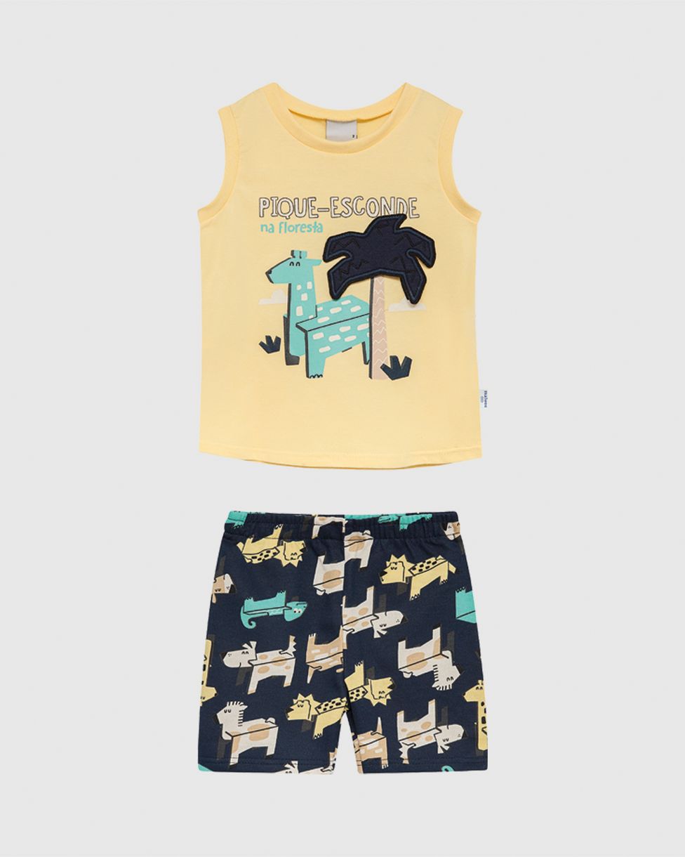 O Conjunto Infantil Menino Pique-Esconde Na Floresta Em Algodão Malwee Kids garante conforto e diversão para o dia a dia dos meninos! Com regata estampada com aplique interativo e bermuda em moletinho, é ideal para aventuras e brincadeiras ao ar livre.