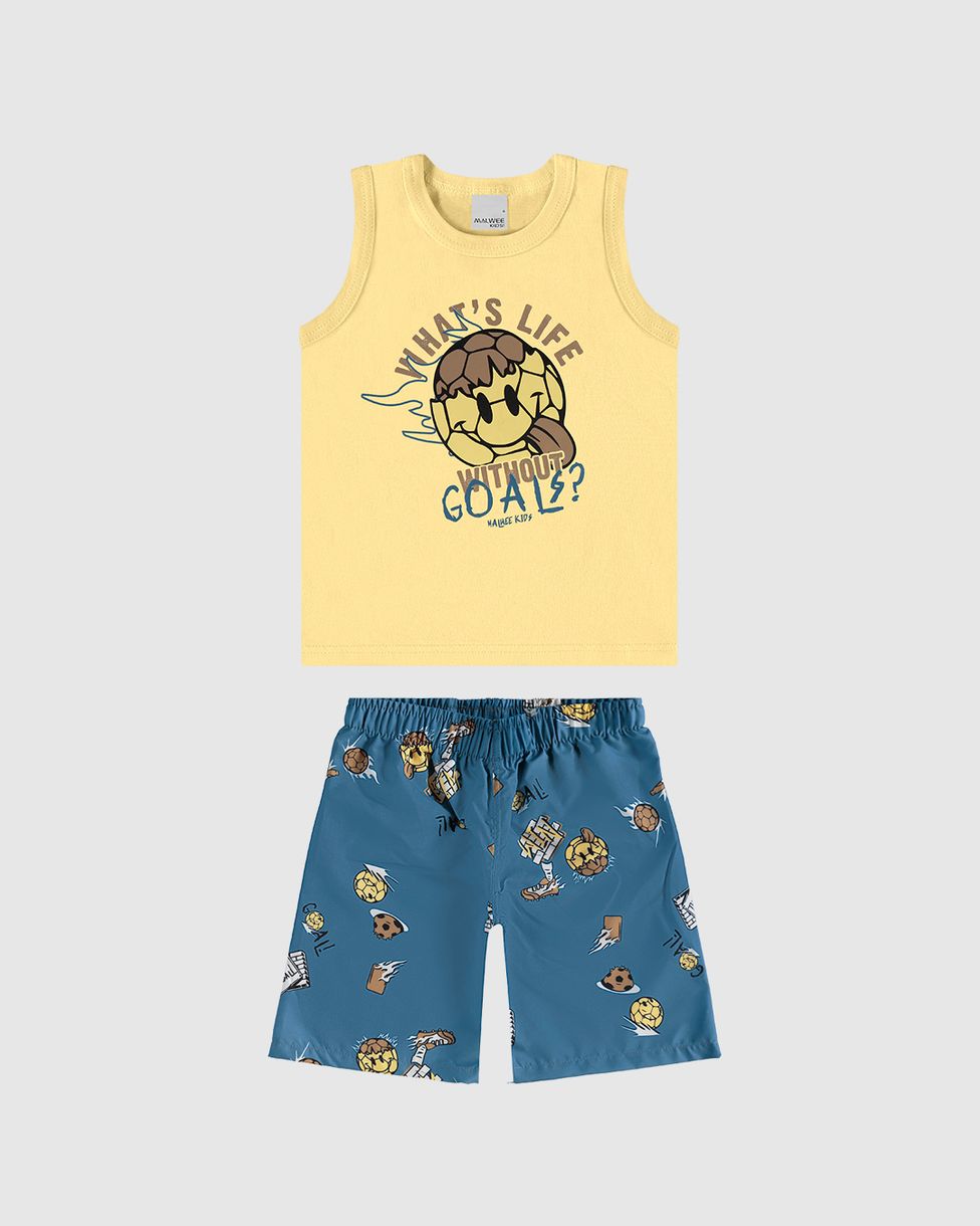 Conjunto Infantil Menino What’s Life Without Goals? em Algodão Malwee Kids: perfeito para os meninos que adoram somar estilo e atitude. Confeccionado em algodão macio, inclui uma regata com mensagem inspiradora e um short confortável em microfibra. Ideal para momentos de diversão, passeios e dias ativos.