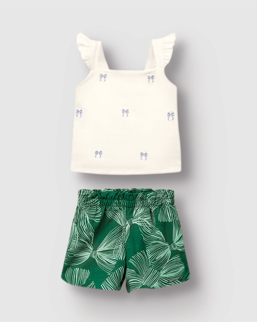 A combinação perfeita de charme e diversão para os dias de sol! Este Conjunto Carinhoso é um verdadeiro encanto. A blusa em algodão macio se destaca pelos babados nas alças e pelos delicados bordados de lacinhos. O shorts estampado, leve e confortável, completa o visual com muita alegria e liberdade para as brincadeiras.