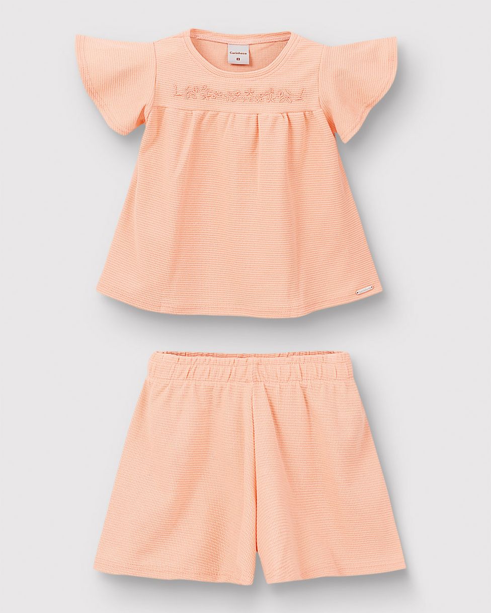 Conjunto Menina Blusa Com Bordado E Shorts Em Malha Texturizada - Carinhoso