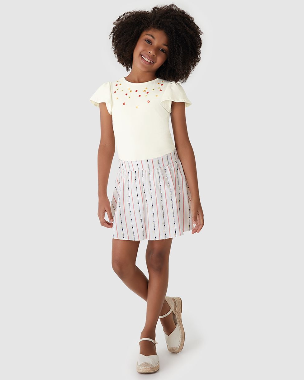 A doçura de um jardim em um look encantador! O Conjunto Carinhoso é pura delicadeza. A blusa em algodão macio ganha um charme especial com o bordado floral salpicado no colo e as mangas franzidas. A saia listrada, leve e texturizada, completa o visual com um toque moderno e divertido.