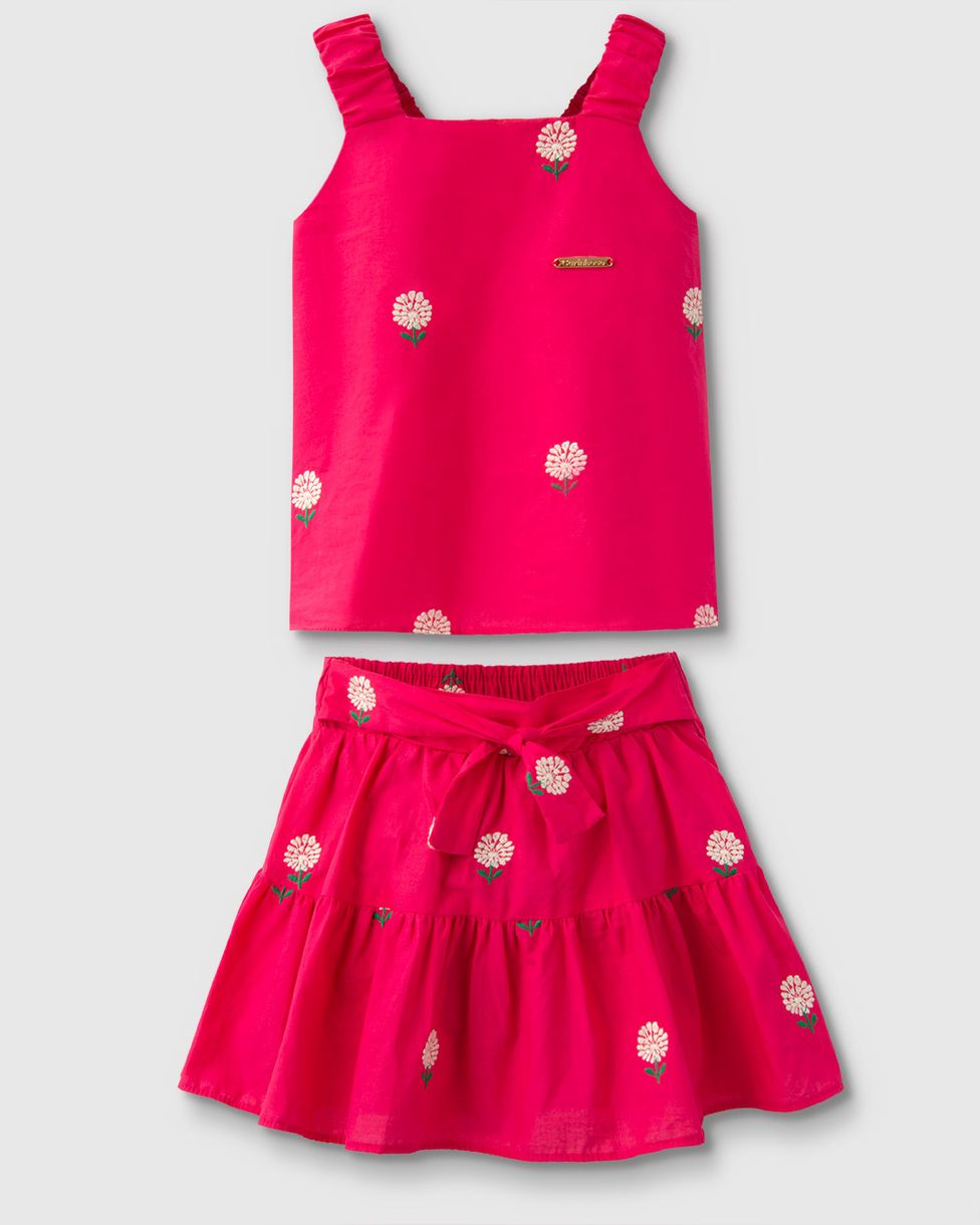 Conjunto Menina Blusa De Alça Com Saia Em Tecido Bordado - Carinhoso