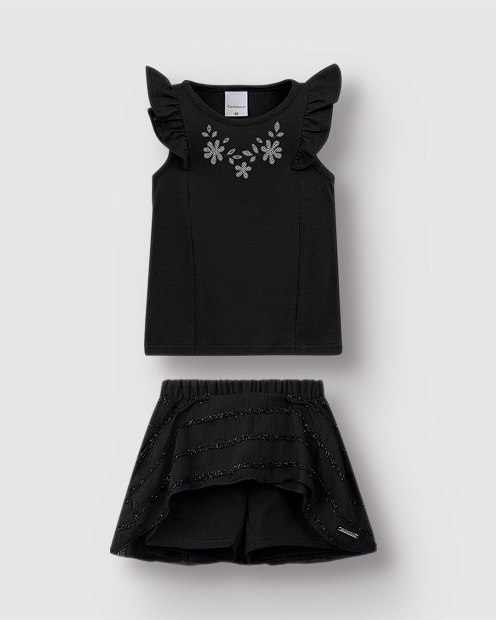 Um look cheio de charme para ocasiões especiais! O Conjunto Carinhoso une a delicadeza do bordado floral na blusa com o brilho sutil da saia em tecido listrado. Com babados nas mangas e um caimento leve, é a escolha perfeita para sua menina se sentir linda e confortável em qualquer festinha ou passeio.