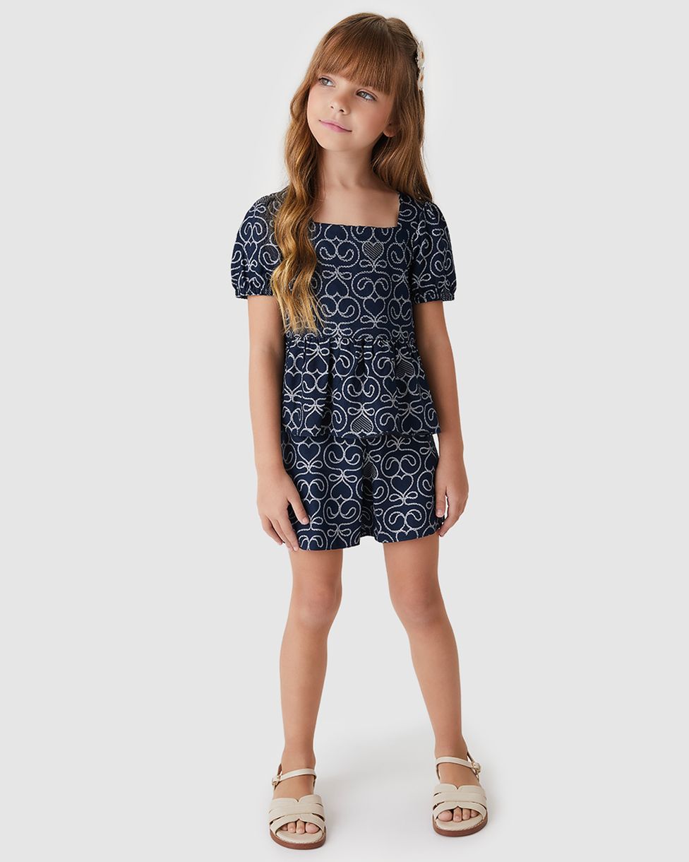 Conjunto Menina Blusa E Shorts Estampa Corações Em Crepe Viscose - Carinhoso Azul - 10