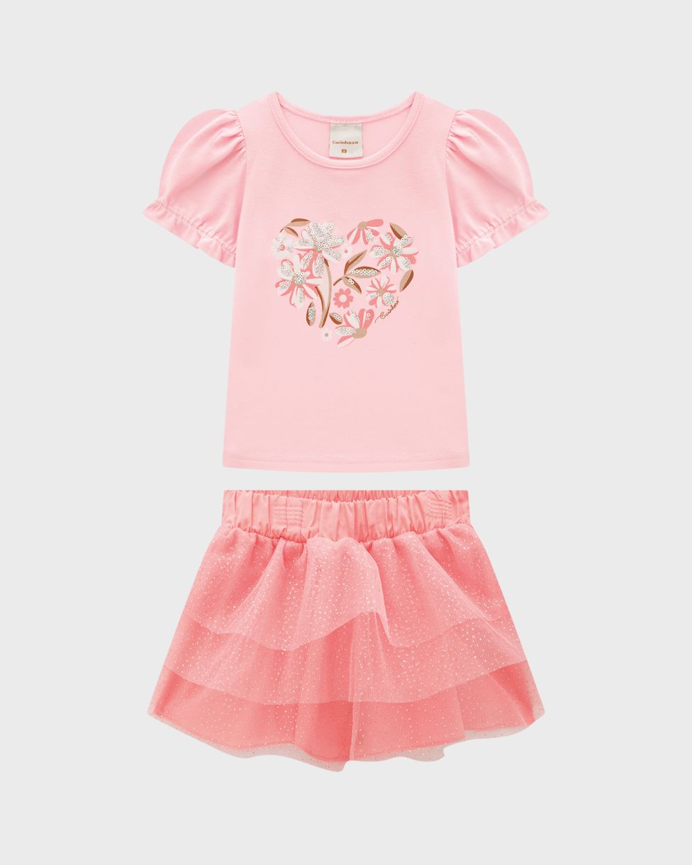 Conjunto Menina Blusa Estampa Bordada E Saia De Tule - Carinhoso