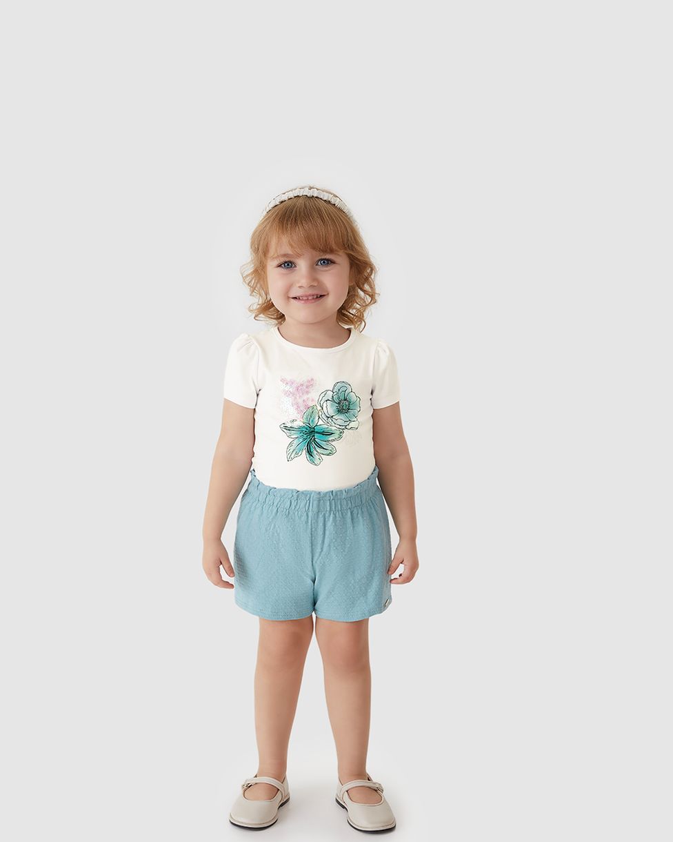 Conjunto Menina Blusa Estampa Flores Bordado Lantejoula - Carinhoso Off White - 1