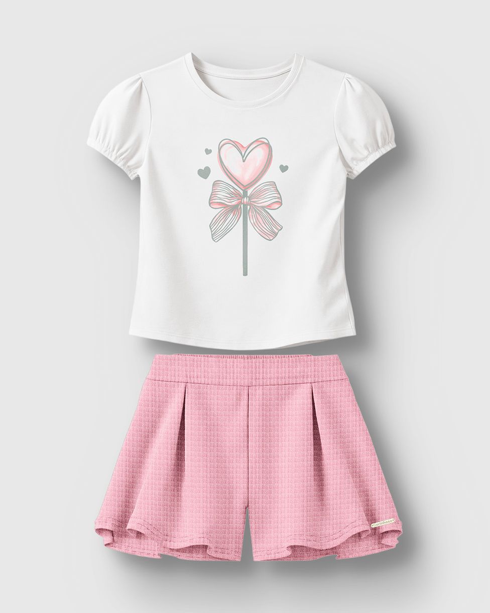 O Conjunto Menina Blusa Estampa Laço E Coração Foil Em Algodão - Carinhoso é perfeito para quem busca conforto com um toque delicado de brilho. A blusa em cotton light traz estampa foil de laço e coração, combinando com o shorts saia em meia malha texturizada que oferece liberdade e estilo.