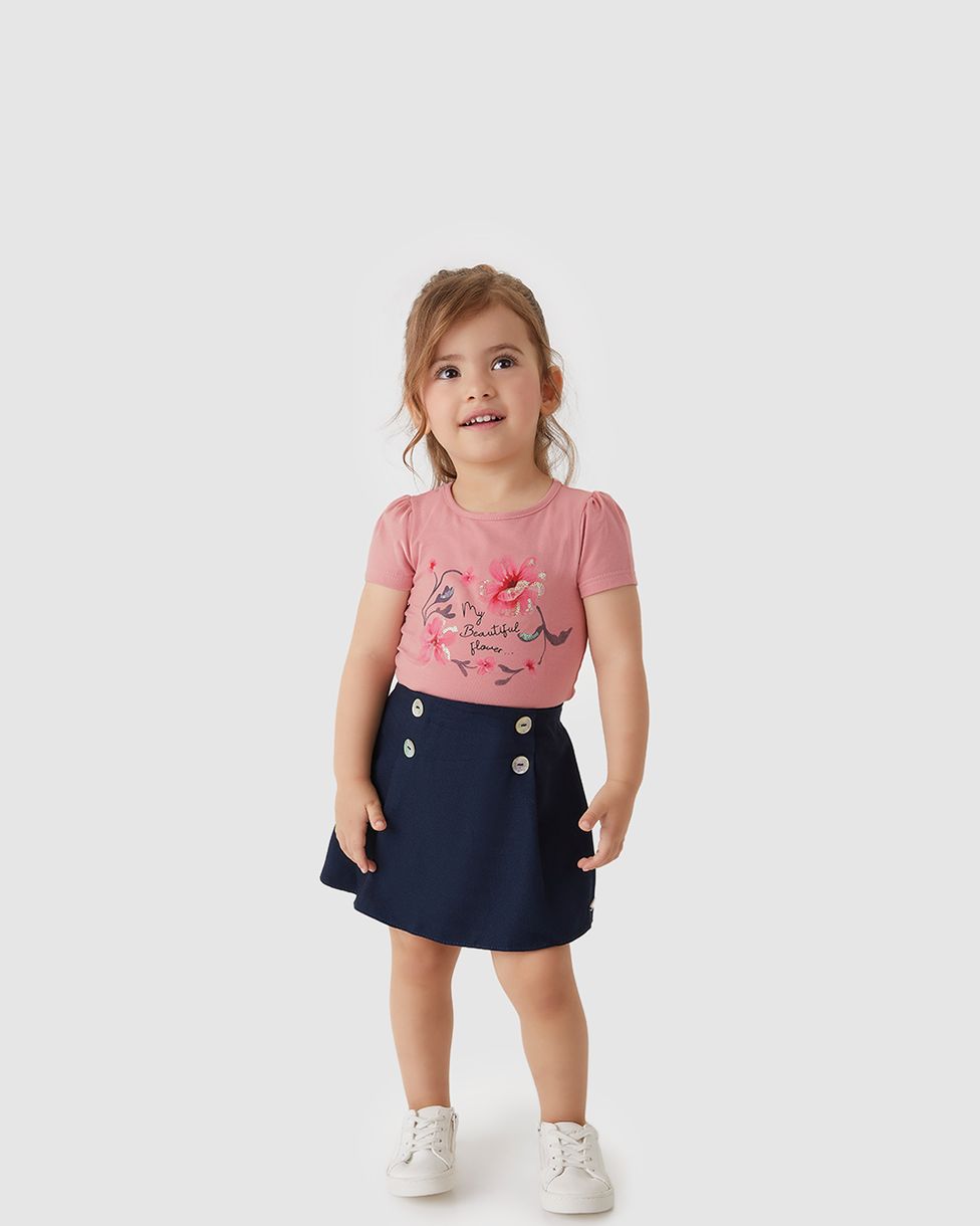 O Conjunto Carinhoso é a tradução de charme e conforto para sua garota. A blusa em algodão macio encanta com sua estampa floral “My beautiful flower”, que ganha vida com um delicado bordado de lantejoulas. O shorts-saia, prático e moderno, garante liberdade total para as brincadeiras do dia a dia.