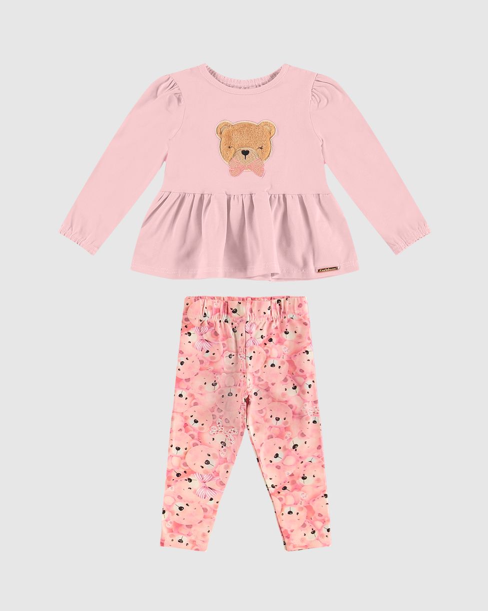 Conjunto Menina Blusa Manga Longa Aplique Bordado Em Algodão - Carinhoso