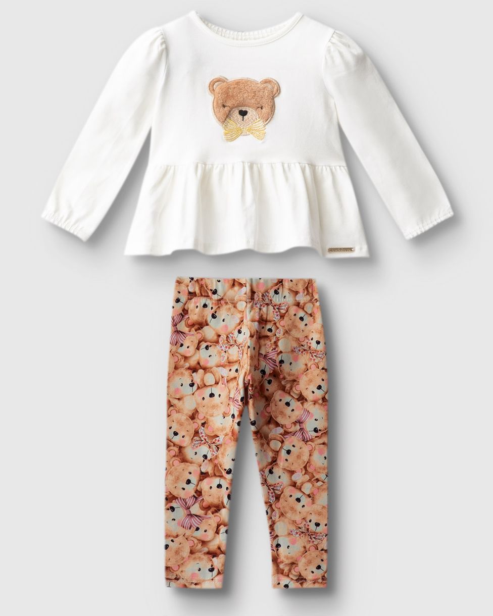 Conjunto Menina Blusa Manga Longa Aplique Bordado Em Algodão - Carinhoso