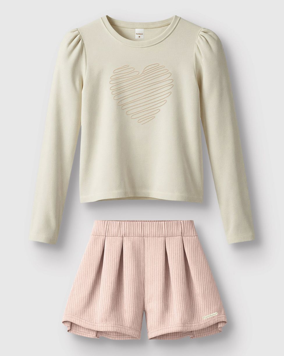 O Conjunto Blusa + Shorts da Carinhoso é a escolha ideal para o Outono Inverno 26. Combinando a leveza da malha algodão na blusa com a sofisticação da malha texturizada no shorts, este conjunto oferece um visual romântico e moderno, garantindo total conforto para o dia a dia das meninas.