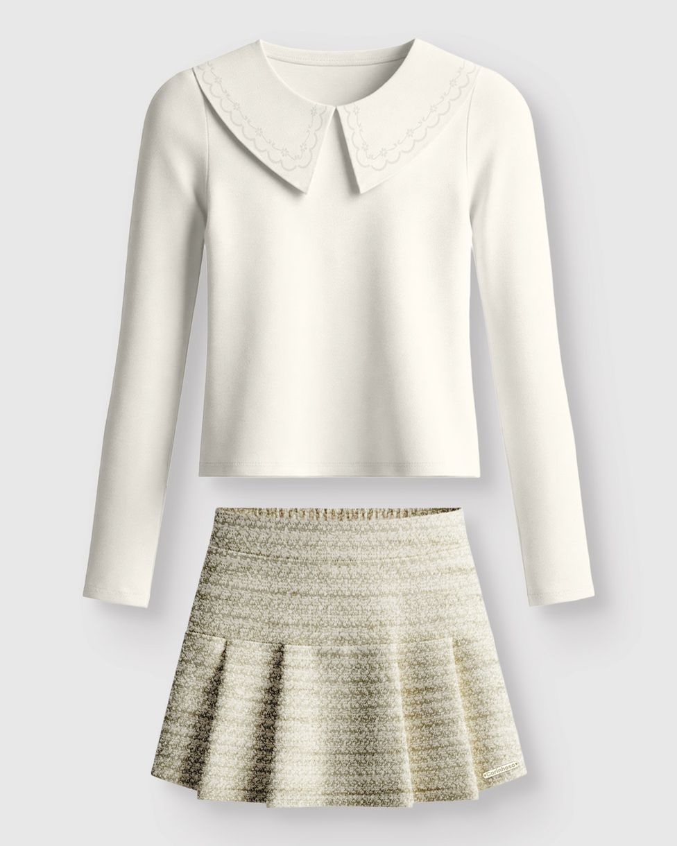 O Conjunto Carinhoso é a tradução de elegância e doçura para a coleção Outono Inverno 26. A blusa em cotton light encanta com o bordado delicado na gola boneca, enquanto o shorts saia em malha tweed lurex plissado oferece um brilho sutil e moderno para momentos especiais.