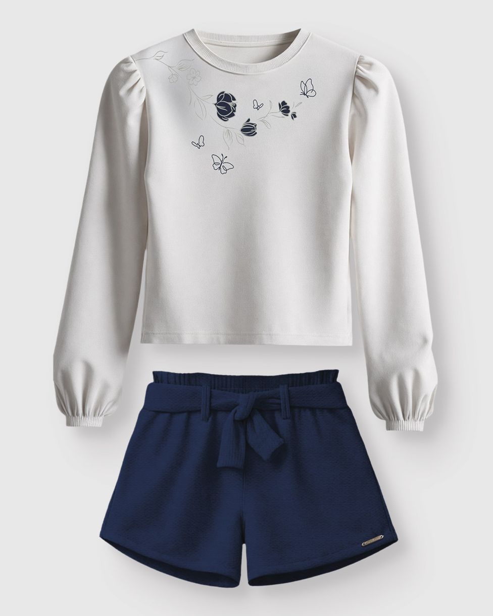 O Conjunto Carinhoso une o toque macio da malha algodão à sofisticação da malha texturizada. Composto por uma blusa de manga longa com bordado delicado e um shorts clochard com amarração, este visual da coleção Outono Inverno 26 garante estilo e conforto para sua menina.