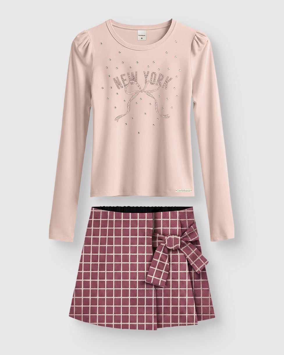 Conjunto Menina Blusa New YorK E Shorts Saia Em Piquet Geométrico - Carinhoso