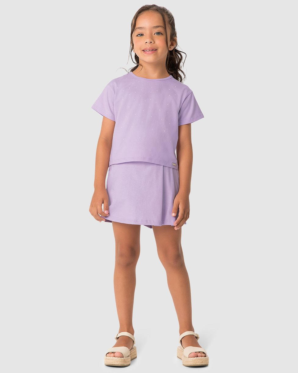 Brilho e delicadeza para iluminar o dia! O Conjunto Menina da Carinhoso combina a elegância da blusa com aplicação de strass com o encanto do shorts saia com efeito glitter, proporcionando conforto e um toque de sofisticação para diversas ocasiões. Um look perfeito para momentos cheios de estilo.