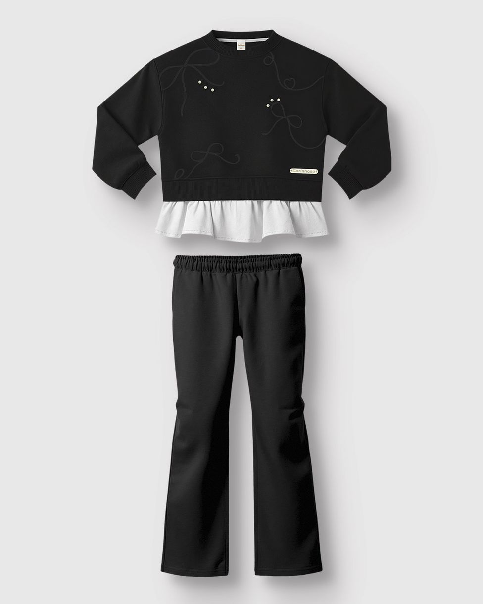 O Conjunto Blusão + Calça da Carinhoso é a escolha ideal para o Outono Inverno. Feito em moletom stretch flanelado, ele une o máximo conforto térmico a um design sofisticado com detalhes em pérolas e barra de babado, garantindo que as meninas fiquem aquecidas e cheias de estilo.