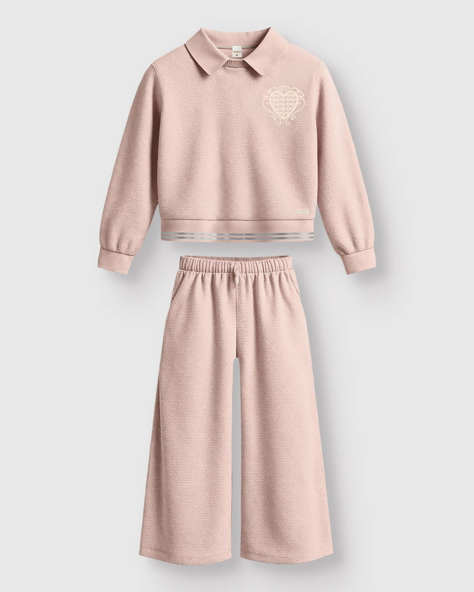 O Conjunto Blusão + Calça da Carinhoso é a tradução de modernidade e conforto para o Outono Inverno. Composto por um blusão com gola polo e uma calça wide leg, este conjunto em malha texturizada oferece um visual sofisticado e urbano, perfeito para meninas que amam estar na moda com liberdade.
