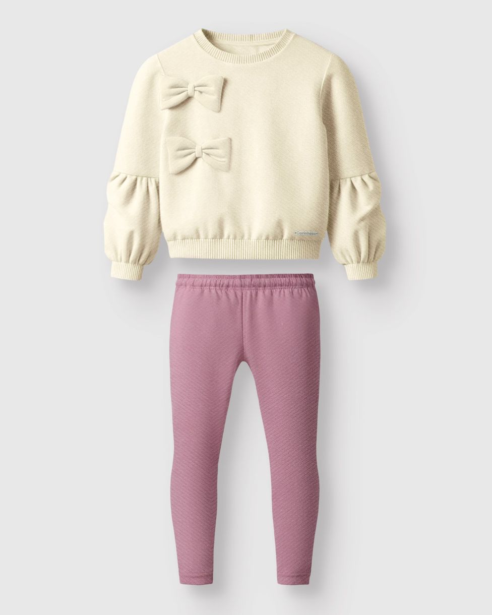 O Conjunto Carinhoso é puro charme para a coleção Outono Inverno 26. O blusão em moletom sarjado destaca-se pelas elegantes mangas bufantes e aplique de laços, enquanto a calça em moletom stretch flanelado garante o máximo conforto e aquecimento para os dias frios.