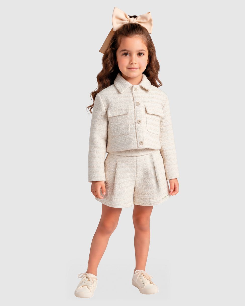O Conjunto Casaco + Shorts da Carinhoso é a escolha perfeita para o Outono Inverno. Feito em malha tweed lurex, ele une a sofisticação do brilho sutil com o conforto necessário para as meninas brilharem em qualquer ocasião com muito estilo e elegância.
