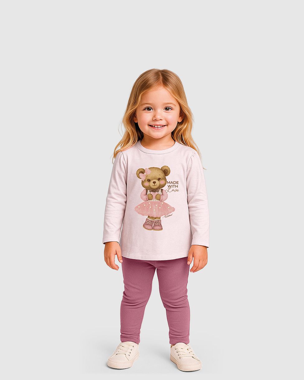 O Conjunto Carinhoso traz a doçura da coleção Outono Inverno 26 para o guarda-roupa da sua menina. Composto por uma blusa em malha texturizada e calça em malha algodão, o destaque fica para a estampa com pérolas de ursinha, unindo delicadeza e conforto em uma peça "Made with Love".