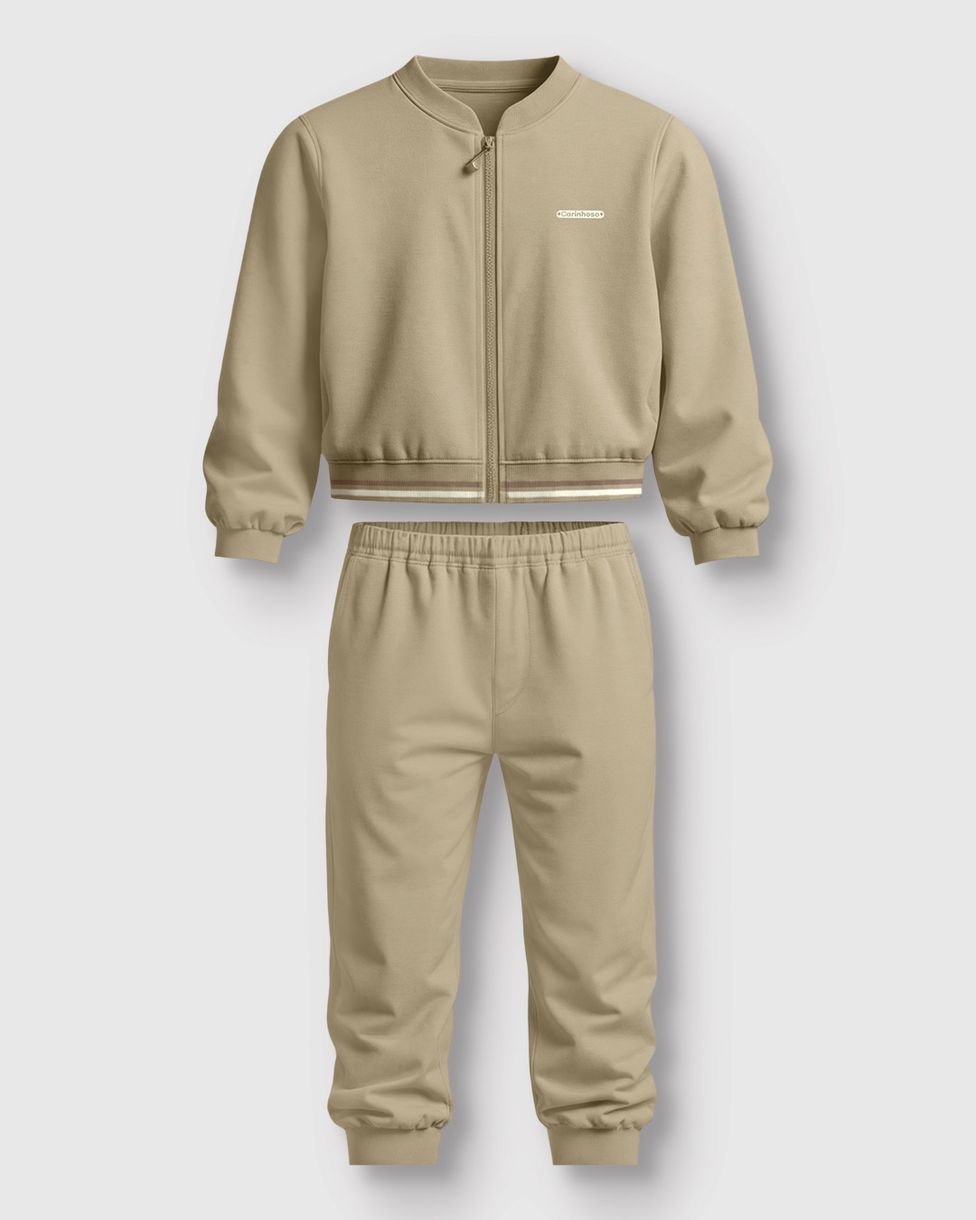 O Conjunto Carinhoso une o estilo esportivo ao conforto térmico da coleção Outono Inverno 26. A jaqueta possui um exclusivo bordado com lantejoulas nas costas com o tema "College Club", enquanto a calça oferece praticidade com bolso funcional, ambos confeccionados em moletom stretch flanelado.