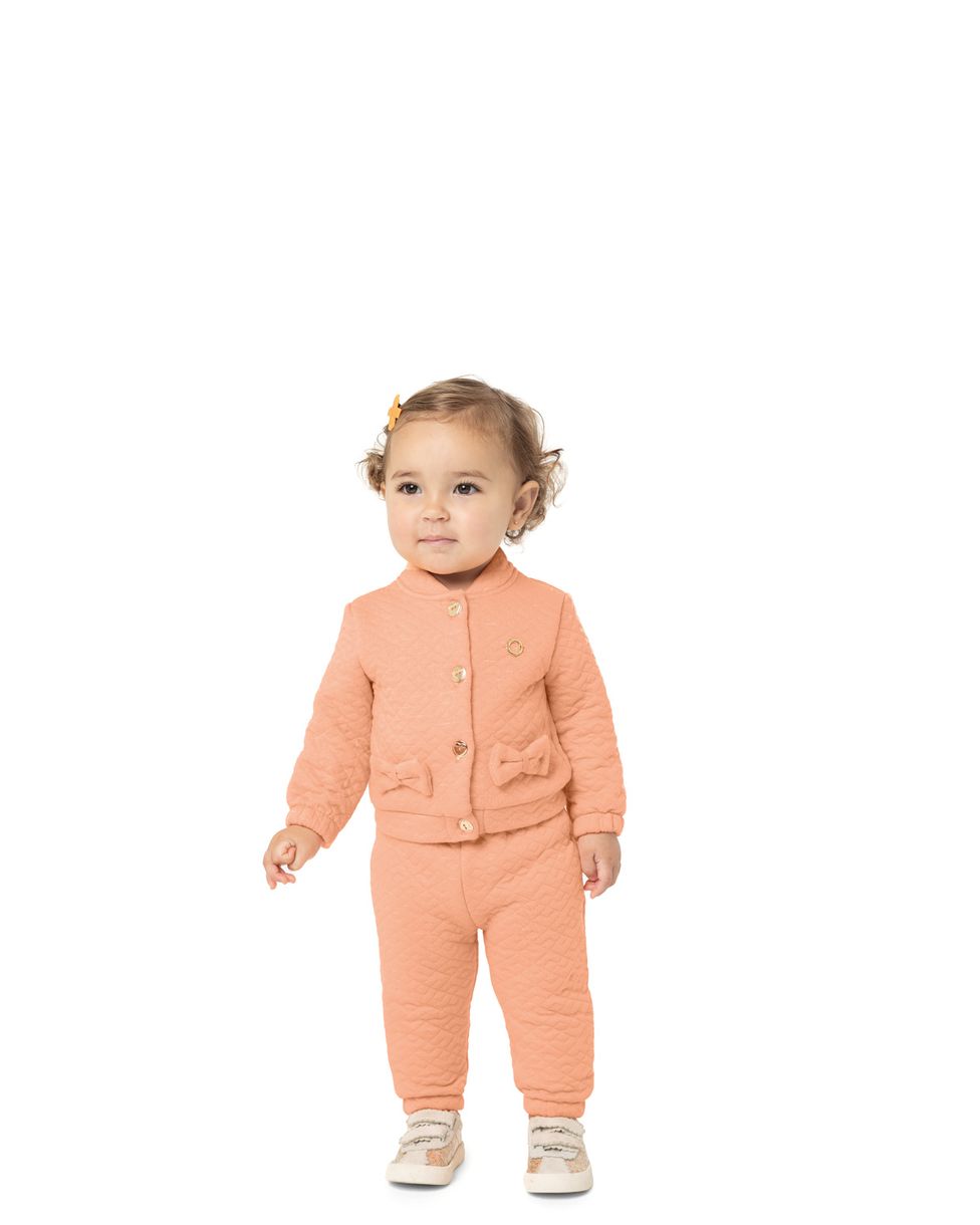 O Conjunto Menina Lacinho em Malha Metalassê - Carinhoso é perfeito para as bebês. O conjunto é composto por uma jaqueta e uma calça em malha metalassê, proporcionando maciez e liberdade de movimento. O detalhe de lacinho traz delicadeza e charme ao conjunto, deixando as meninas ainda mais encantadoras. O blusão possui mangas longas e gola redonda, proporcionando maior conforto ao vestir. A calça possui cós elástico, facilitando o vestir e garantindo um ajuste perfeito.