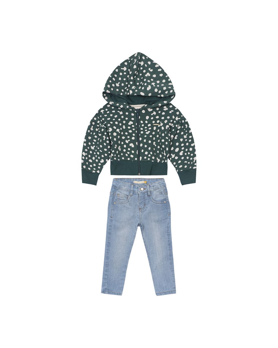 Conjunto confeccionado em moletom stretch flanelado com detalhe em malha de algodão e jeans com elastano. Apresentando um conjunto super quentinho e perfeito para o dia a dia das pequenas, a Jaqueta estampada conta com shape Cropped, mangas com cavas deslocadas, abertura por zíper e plaqueta metalica no peitoral. A calça Skinny em jeans com elastano complementa o conjunto, tendo sua cintura com elastico ajustavel, fecho por braguilha, bolsos frontais e posteriores com etiqueta decorativa. Fica perfeito se combinar com botinha!