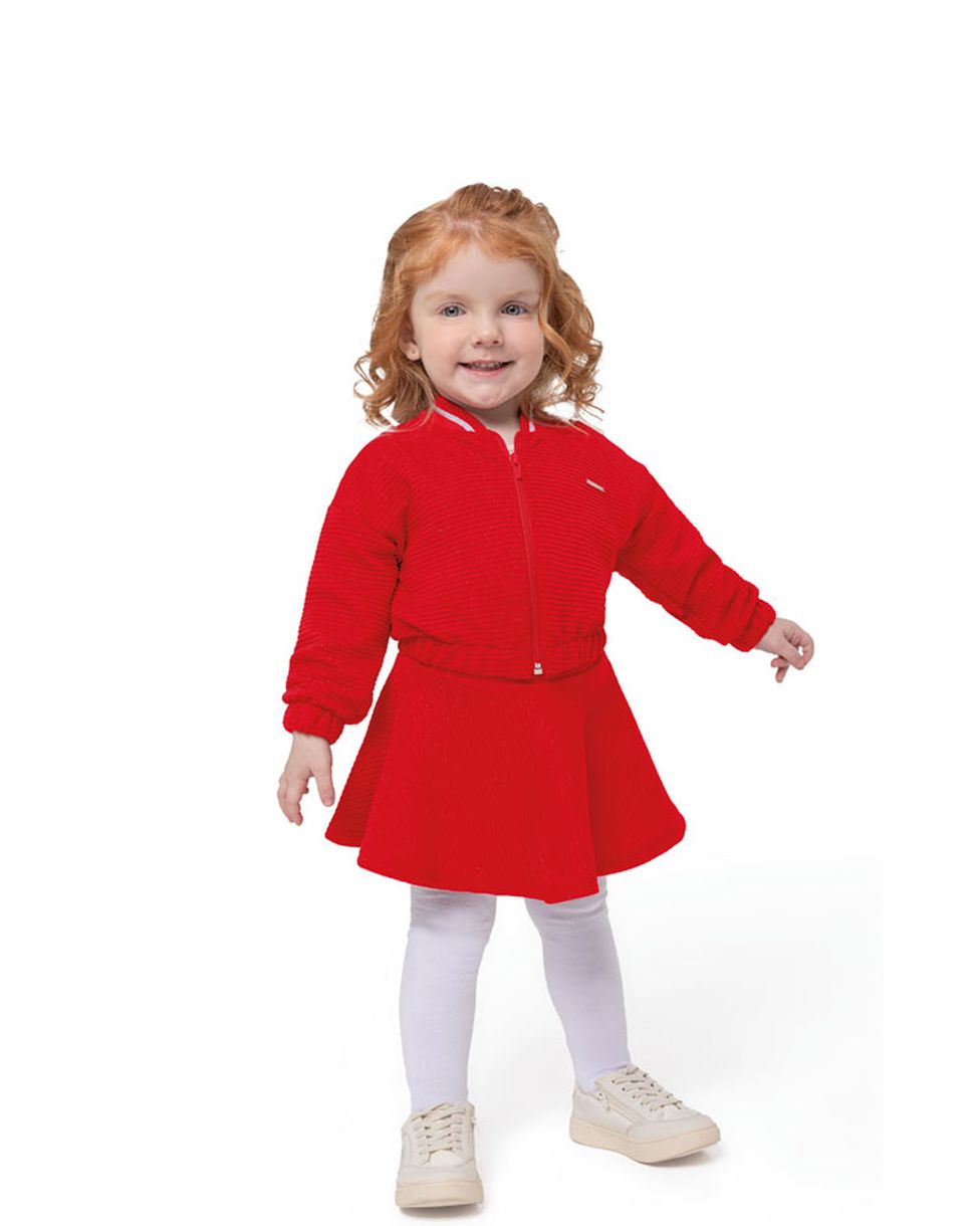 Conjunto confeccionado em malha canelada com brilho e malha de algodão. Apresentando um conjunto super fofo e com estilo esportivo para as meninas, a Jaqueta com shape Cropped, apresenta gola alta em retilínea, mangas longas com cavas deslocadas, plaqueta metalica no peitoral e barra e punhos marcados em elastico. Ja a sua parte inferior em saia shorts Godê, conta com shorts embutido para garantir total conforto e liberdade de movimentos para as pequenas. Combine com tênis!