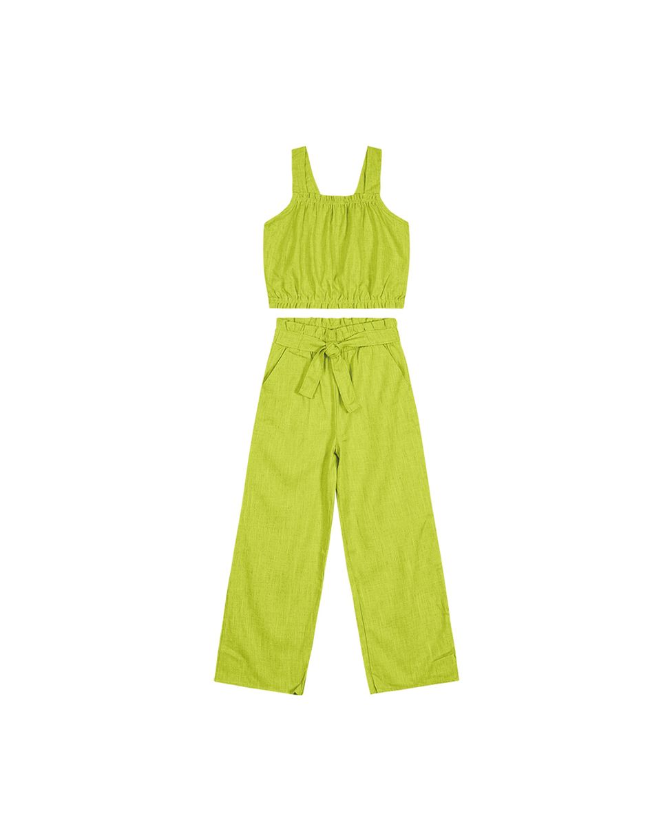 Conjunto confeccionado em tecido de viscolinho. Apresentando peças estilosas para as meninas, é o conjunto perfeito para usar na estação. Contando com Blua Cropped possuindo decote reto, alças médias e acabamento de costura em elástico e plaqueta metálica nas costas. A Wide Leg complementa o conjunto, estilosa e confortável, essa calça apresenta cintura em elástico com cinto faixa embutido e bolsos frontais funcionais. Nos dias mais quentes, aposte com sandália!