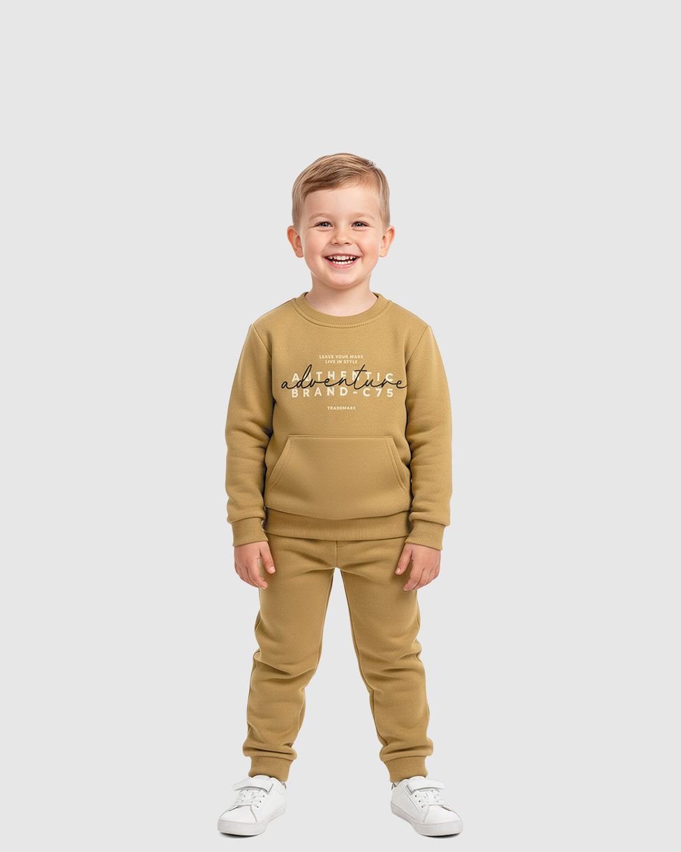 O Conjunto Carinhoso traz o equilíbrio perfeito entre estilo e conforto para a coleção Outono Inverno 26. Confeccionado em moletom sarjado, o blusão apresenta uma moderna estampa com bordado de lettering "Adventure", enquanto a calça garante liberdade total para as descobertas das crianças.