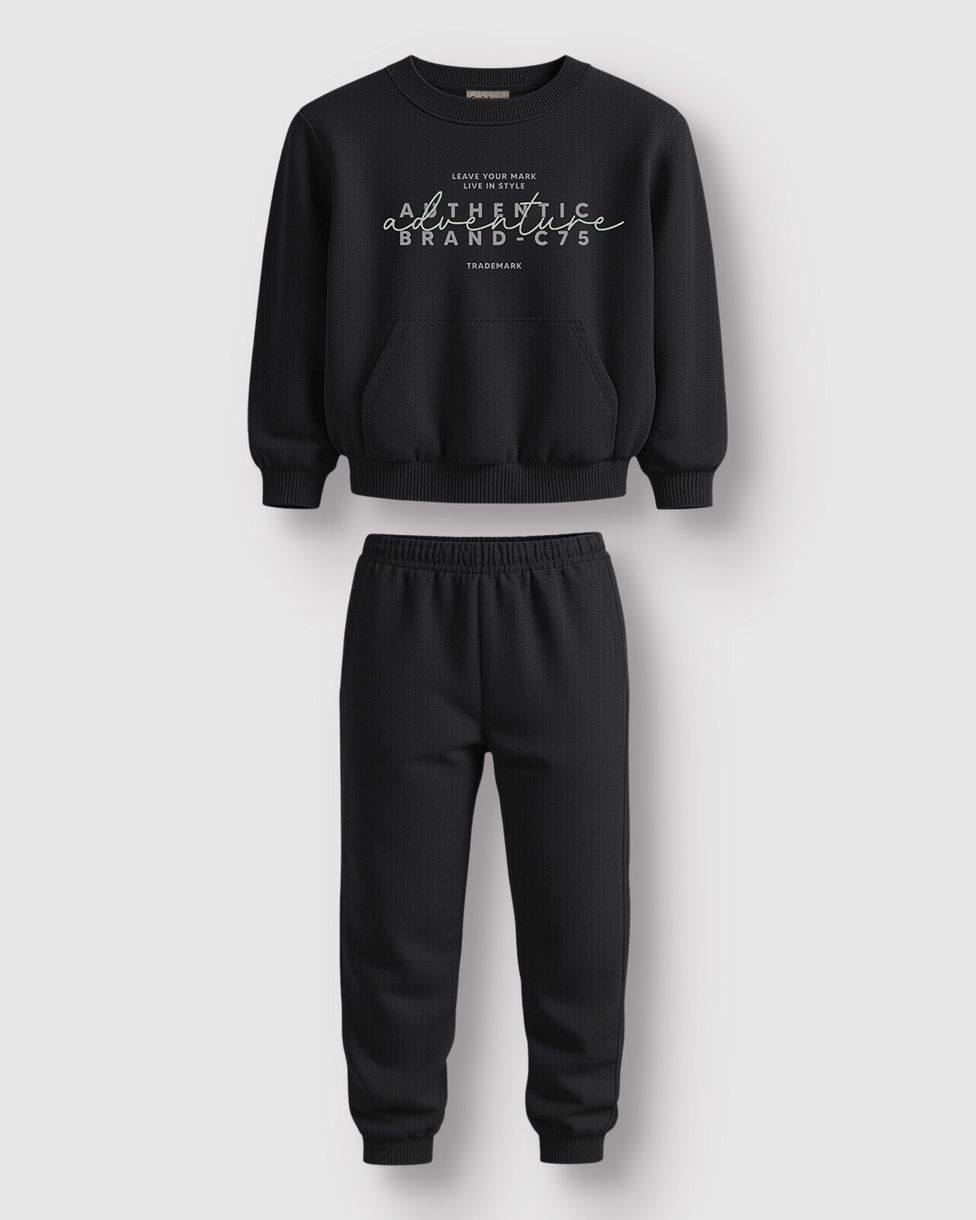 O Conjunto Carinhoso traz o equilíbrio perfeito entre estilo e conforto para a coleção Outono Inverno 26. Confeccionado em moletom sarjado, o blusão apresenta uma moderna estampa com bordado de lettering "Adventure", enquanto a calça garante liberdade total para as descobertas das crianças.
