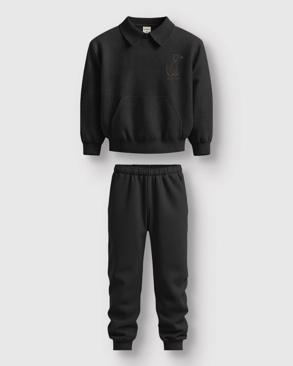O Conjunto Carinhoso une modernidade e conforto para a coleção Outono Inverno 26. O blusão em pelúcia destaca-se pela gola retilínea e elegante bordado peitoral de cachorrinho, enquanto a calça em moletom flanelado garante o aquecimento ideal para os dias frios.