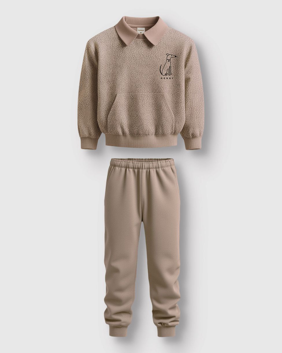 O Conjunto Carinhoso une modernidade e conforto para a coleção Outono Inverno 26. O blusão em pelúcia destaca-se pela gola retilínea e elegante bordado peitoral de cachorrinho, enquanto a calça em moletom flanelado garante o aquecimento ideal para os dias frios.